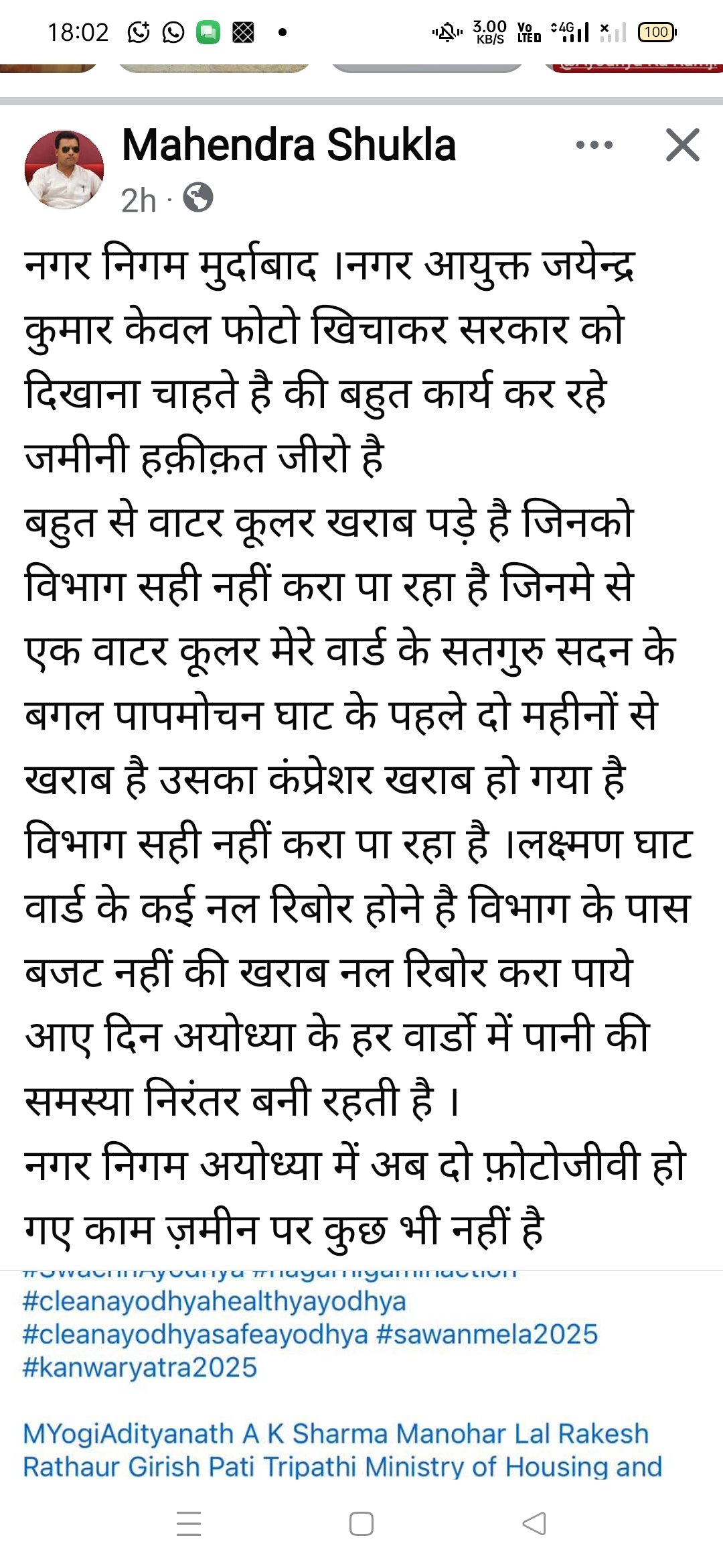 *कलम के कांटे से* *नगर निगम अयोध्या* अब विज्ञान की अद्भुत खोज *”फोटोजीव” पर गर्व करता है।* ये *दुर्लभ जीव पानी नहीं, पब्लिसिटी पीते हैं और विकास नहीं, डिजिटल फिल्टर में सांस लेते हैं।* कभी *नगर आयुक्त साहब नाली के किनारे, कभी खंभे के नीचे* हर जगह कैमरे को देखकर *खुद ही स्मार्ट सिटी महसूस करने लगते हैं।* *अब आप पूछेंगे, जमीनी हकीकत?* अरे जनाब! *जमीन तो सिर्फ टेंडर पास करने और फोटो खींचने के लिए होती है, काम करने के लिए नहीं।* *लक्ष्मण घाट वार्ड पार्षद के प्रतिनिधि…